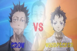 The match was hosted in a giant metal cage with a big tree in the middle. It began with Crow and Woodpecker injuring themselves to release their blood. Woodpecker immediately flees into the tree with Crow chasing him. Ganta turns and shoots a couple of blood bullets at him. Crow deflects all of them easily. Ganta collects more blood and shoots it with more power. Crow slices it in two and dodges it. Ganta feels dizzy and realizes he has massive blood loss. While Ganta was still far away from Crow, Crow sliced the trees, and Ganta with them. Ganta wonders how Crow was able to cut him from so far. The reason is that Crow can organize his blades as nets so that they can reach further without the need for more blood. Crow continues to slice Ganta until he stays on the ground. The match seems decided.