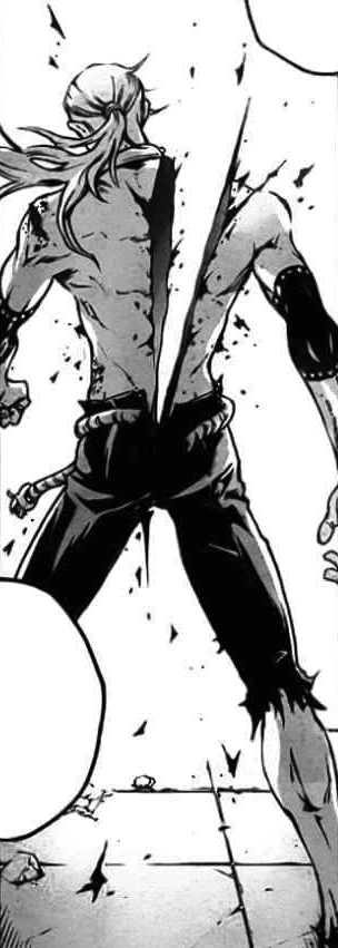 Branch of Sin: Rari Ranshin (乱离乱身, Rari Ranshin, lit. Decimating Frenzy): Rari Ranshin allows him to create scorpion tail-like tentacles that inject himself with blood. This causes his arms or legs to enlarge and become extremely muscular, like some kind of doping; he gains superhuman strength, powerful enough to strengthen his muscles and tendons and shatter Senji's normal Crow Claw blade. Ikazuchi doesn't use his Branch of Sin as a main weapon, but rather his enlarged body.