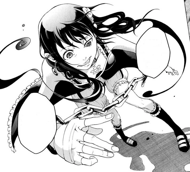 Branch of Sin: As a Deadman, Minatsuki possesses a Branch of Sin. This allows her to freely control her blood outside of her body. To forcedly bring her blood out, she rips out one of her earrings.